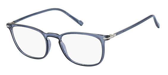 Прямоугольные очки, из материала пластик и цвете синий помогут понять основные черты новой коллекции оправ модного бренда PIERRE CARDIN.