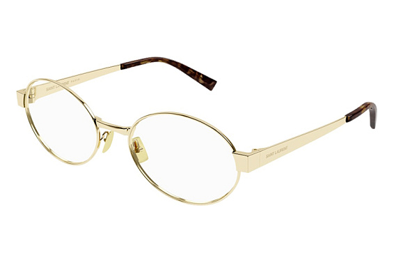 Овальные очки, из материала традиционные металлы и цвете золото помогут понять основные черты новой коллекции оправ модного бренда SAINT LAURENT.