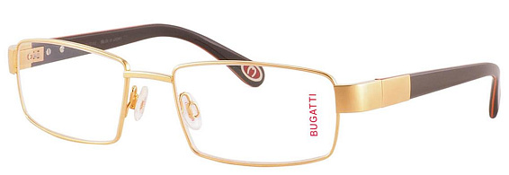 Прямоугольные очки, из материала пластик и цвете золото помогут понять основные черты новой коллекции оправ модного бренда BUGATTI.