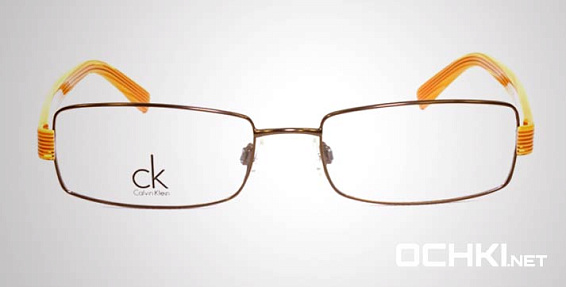 Прямоугольные очки, из материала пластик и цвете золото помогут понять основные черты новой коллекции оправ модного бренда CALVIN KLEIN.