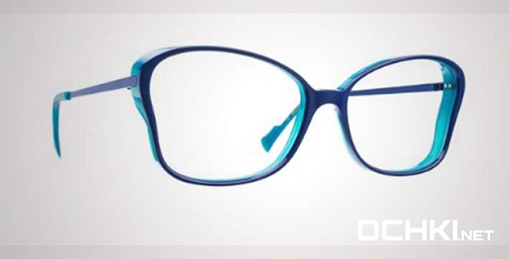 Необычной формы очки, из материала пластик и цвете синий помогут понять основные черты новой коллекции оправ модного бренда CAROLINE ABRAM.