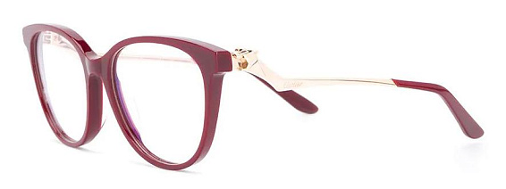 Прямоугольные очки, из материала пластик и цвете бордовый помогут понять основные черты новой коллекции оправ модного бренда CARTIER.