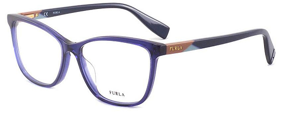 Прямоугольные очки, из материала пластик и цвете синий помогут понять основные черты новой коллекции оправ модного бренда FURLA.
