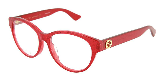 Овальные очки, из материала пластик и цвете красный помогут понять основные черты новой коллекции оправ модного бренда GUCCI.