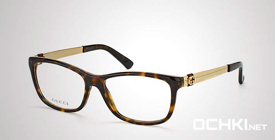 Прямоугольные очки, из материала пластик и цвете золото помогут понять основные черты новой коллекции оправ модного бренда GUCCI.