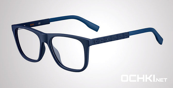 Прямоугольные очки, из материала пластик и цвете синий помогут понять основные черты новой коллекции оправ модного бренда HUGO BOSS.