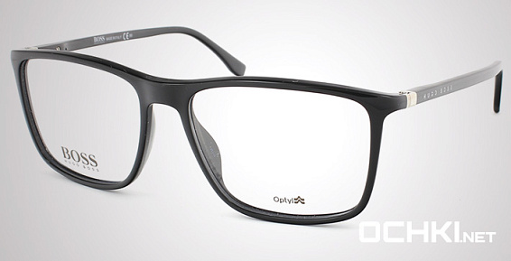 Прямоугольные очки, из материала пластик и цвете черный помогут понять основные черты новой коллекции оправ модного бренда HUGO BOSS.