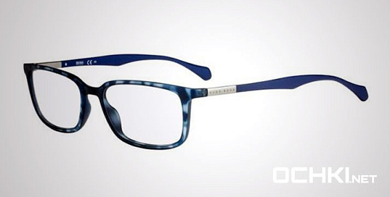 Прямоугольные очки, из материала пластик и цвете синий помогут понять основные черты новой коллекции оправ модного бренда HUGO BOSS.