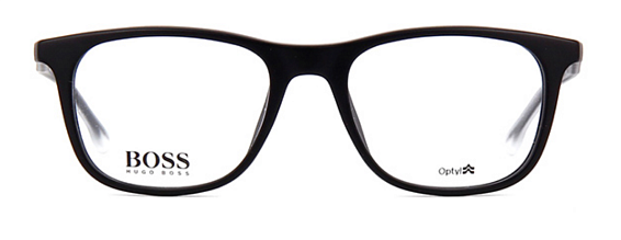 Прямоугольные очки, из материала пластик и цвете черный помогут понять основные черты новой коллекции оправ модного бренда HUGO BOSS.