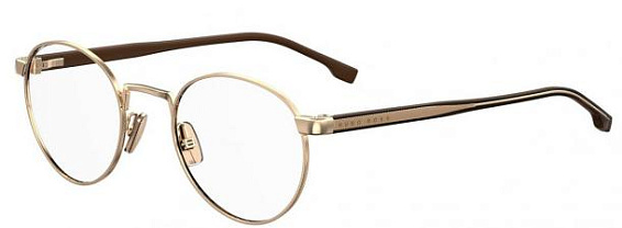Прямоугольные очки, из материала пластик и цвете золото помогут понять основные черты новой коллекции оправ модного бренда HUGO BOSS.