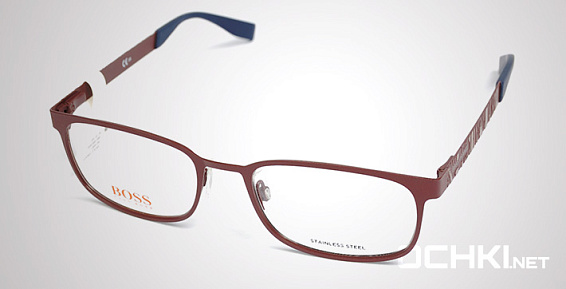 Прямоугольные очки, из материала традиционные металлы и цвете красный помогут понять основные черты новой коллекции оправ модного бренда HUGO BOSS.