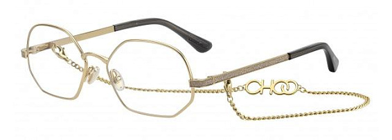 Овальные очки, из материала традиционные металлы и цвете золото помогут понять основные черты новой коллекции оправ модного бренда JIMMY CHOO.