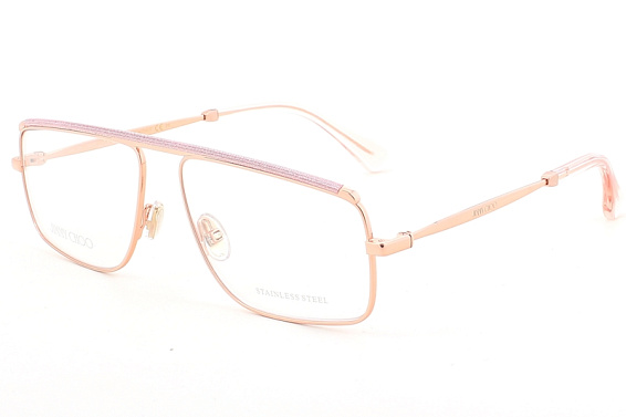 Прямоугольные очки, из материала традиционные металлы и цвете розовый помогут понять основные черты новой коллекции оправ модного бренда JIMMY CHOO.