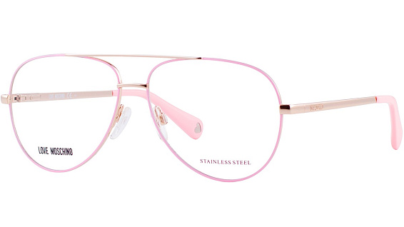 Авиатор очки, из материала традиционные металлы и цвете розовый помогут понять основные черты новой коллекции оправ модного бренда LOVE MOSCHINO.