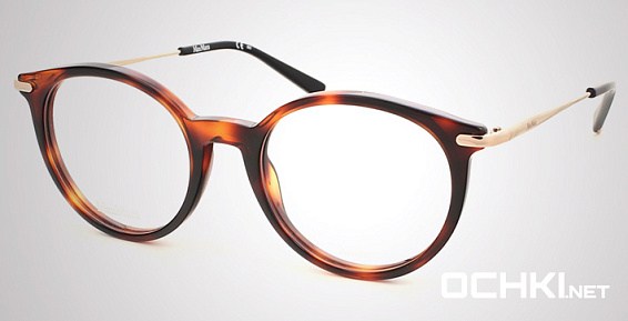 Овальные очки, из материала пластик и цвете золото помогут понять основные черты новой коллекции оправ модного бренда MAX MARA.
