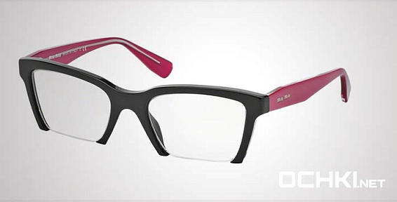 Необычной формы очки, из материала пластик и цвете черный помогут понять основные черты новой коллекции оправ модного бренда MIU MIU.