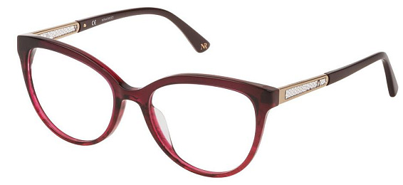 Прямоугольные очки, из материала пластик и цвете бордовый помогут понять основные черты новой коллекции оправ модного бренда NINA RICCI.