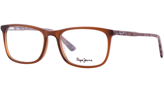 Прямоугольные очки, из материала пластик и цвете коричневый помогут понять основные черты новой коллекции оправ модного бренда PEPE JEANS.