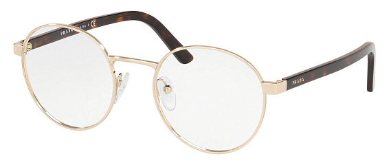 Прямоугольные очки, из материала пластик и цвете золото помогут понять основные черты новой коллекции оправ модного бренда PRADA.