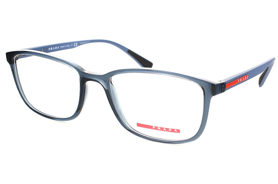 Прямоугольные очки, из материала пластик и цвете синий помогут понять основные черты новой коллекции оправ модного бренда PRADA.
