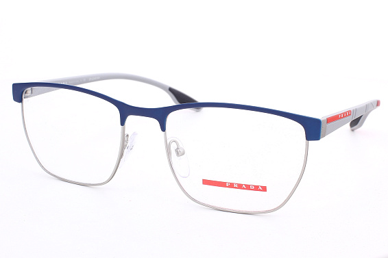 Прямоугольные очки, из материала пластик и цвете синий помогут понять основные черты новой коллекции оправ модного бренда PRADA.
