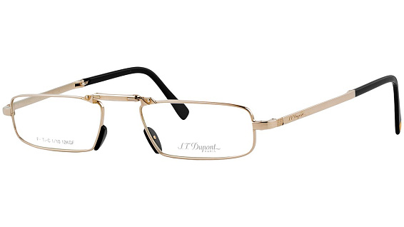 Прямоугольные очки, из материала титан и цвете золото помогут понять основные черты новой коллекции оправ модного бренда S.T. DUPONT.