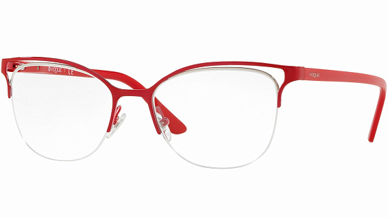 Прямоугольные очки, из материала традиционные металлы и цвете красный помогут понять основные черты новой коллекции оправ модного бренда VOGUE.