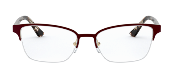 Прямоугольные очки, из материала пластик и цвете бордовый помогут понять основные черты новой коллекции оправ модного бренда PRADA.